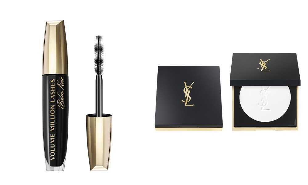 Тушь для объема ресниц Volume Million Lashes Balm Noir, L’Oreal Paris; компактная пудра для лица All Hours Powder, YSL.