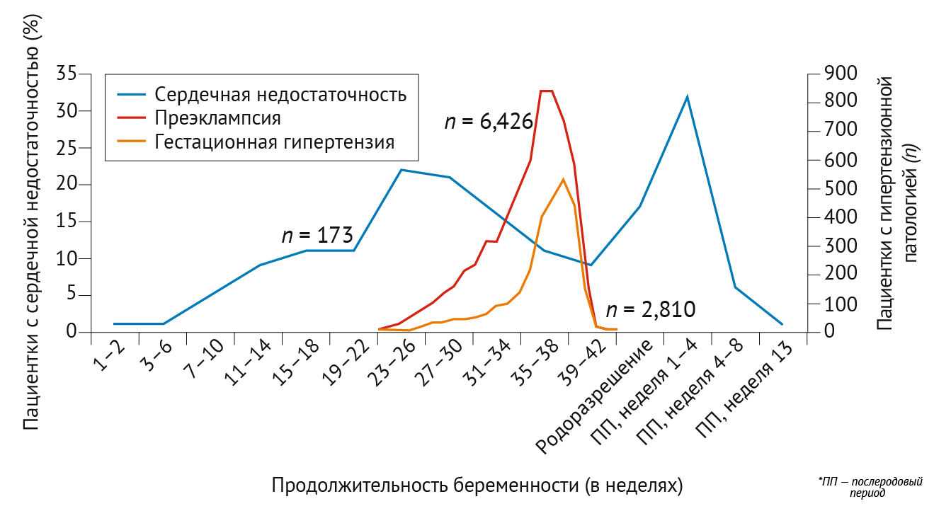 Сердечный выброс повышается как минимум на 30–50 % в первые два триместра беременности, но результаты в третьем триместре противоречивы . В период 26–30 недель адаптация сердечного выброса, по-видимому, по большей части завершена; по данным некоторых исследований, сердечный выброс остается стабильным, другие группы ученых сообщают о его незначительном увеличении или уменьшении . Анатомически увеличение преднагрузки и сократительной способности миокарда проявляется в увеличении массы левого желудочка (24–34 %), увеличении относительной толщины стенки (10 %) и увеличении диаметра левого предсердия (14 %) по сравнению с небеременными женщинами . В родах многие гемодинамические изменения достигают своего пика. Боль, стресс и физическая нагрузка приводят к повышению артериального давления, частоты сердечных сокращений и сердечного выброса . Сокращения матки еще более усиливают этот эффект, поскольку при каждом сокращении 300–500 мл крови возвращается из маточно-плацентарного кровообращения в системный кровоток. Сразу после родов ударный объем и сердечный выброс повышаются в результате аутотрансфузии (теперь уже постоянной) из маточно-плацентарного кровообращения и снятия аортокавальной компрессии . Предполагается, что характер этих физиологических изменений связан со сроками развития сердечно-сосудистых осложнений во время беременности (рис. 2). Анализ The Registry of Pregnancy and Cardiac Disease (Всемирного регистра беременностей у женщин с сердечно-сосудистыми заболеваниями) показал, что частота сердечной недостаточности впервые достигает пика при плато сердечного выброса в 26–30 недель . Второй пик как сердечного выброса, так и частоты сердечной недостаточности наступает после родов, когда аутотрансфузия крови из маточно-плацентарного кровообращения создает состояние перегрузки. Определенные пики сердечной недостаточности контрастируют с постепенным увеличением частоты преэклампсии на протяжении всей беременности (рис. 2).