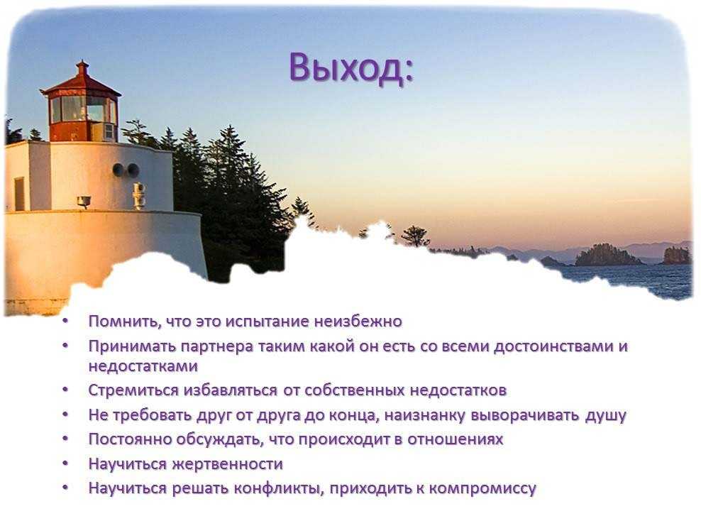 Каждый пережитый кризис делает вашу пару сильнее и крепче. Вы узнаете партнера и себя с других сторон, открываете новые грани в отношениях, выходите на новый уровень – более качественный и гармоничный.Главное, что нужно понимать, — для конструктивного разрешения кризиса нужно обоюдное желание партнеров сохранить семью и продолжить вашу личную историю любви. Больше общайтесь, доверяйте друг другу, будьте честными и открытыми, старайтесь доставить радость партнеру, удивляйте и не бойтесь экспериментировать, создавайте романтику и наполняйте отношения теплом и гармонией – и тогда никакие кризисы не смогут разрушить вашу любовь, добавляя в ее огонь все новые угольки уважения, страсти и эмоциональной близости.