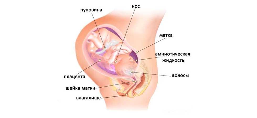 Ребенок скоро начнет опускаться в малый таз. В малом тазу будет существенно меньше места, чем в брюшной полости, именно поэтому малыш старается «сгруппироваться». Он, как правило, скрещивает свои ручки и ножки, а голову несколько опускает. При этом его подбородок становится ближе к груди.
