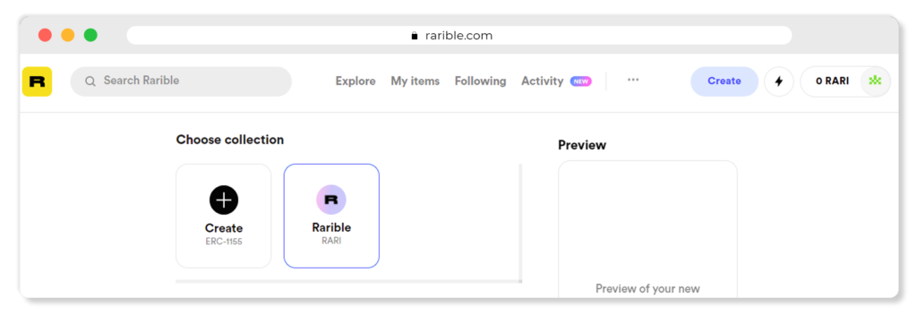 Новая коллекция, а вместе с ней и отдельный смарт-контракт создались. Теперь можно можно выбирать в какой из коллекций будет создан NFT: в общей «Rarible» или в личной, с вашим названием.