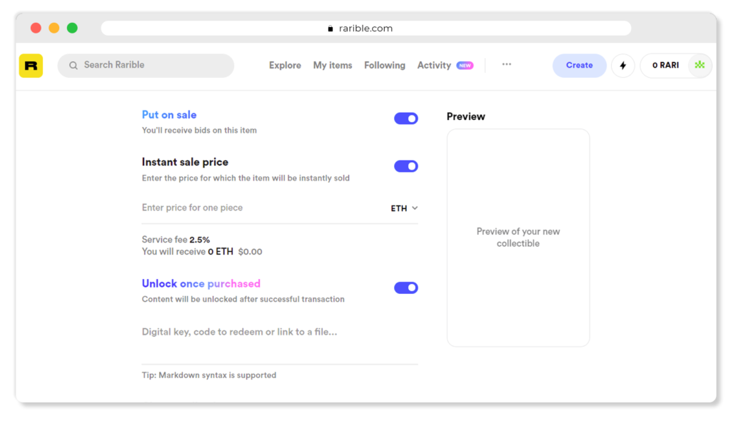 Unlock once purchased. Далее можно добавить контент, который будет доступен только владельцу NFT. Например, ссылку на оригинал работы в высоком разрешении или приглашение в закрытый телеграм-чат. Эту информацию увидят только те пользователи, которые купят предмет и будут им владеть. Здесь даже поддерживает язык разметки Markdown. Знания программирования не понадобятся. Можно заглянуть в шпаргалку, чтобы узнать как делать заголовки, жирный шрифт и даже таблицы.
