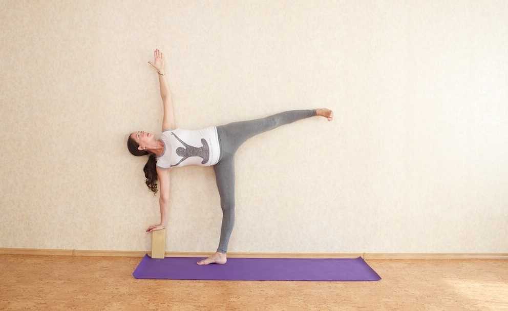 - Полумесяца (Ардха Чандрасана), выполняя ее у стены, с обязательной подставкой под руку. Улучшается осанка, чувство баланса, становятся крепче колени.