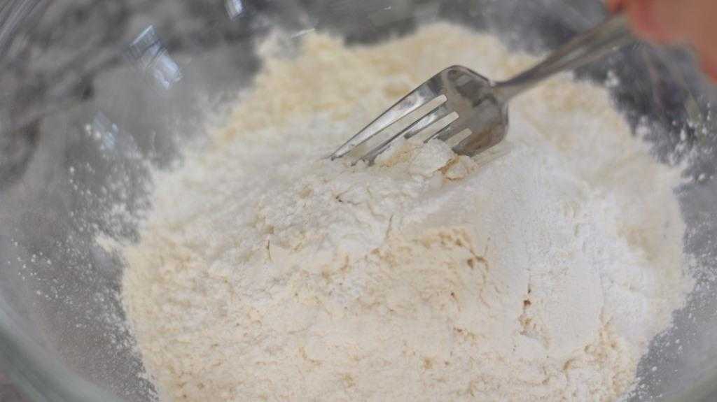 Поместите универсальную муку, разрыхлитель, соль и четверть чайной ложки пищевой соды в миску среднего размера и хорошо перемешайте вилкой или венчиком.