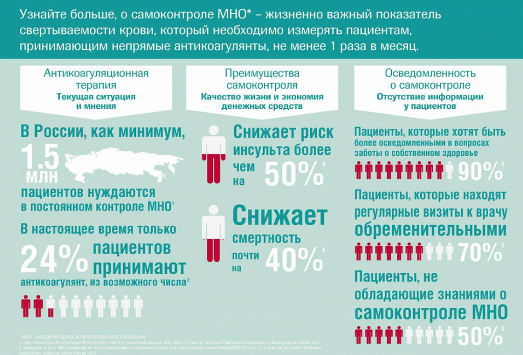 Кроме того, МНО довольно пристально и серьезно врачи контролируют у пациентов, принимающих антикоагулянты (препараты, препятствующие избыточному свертыванию крови), что позволяет своевременно и регулярно контролировать дозировку лекарственного средства. Пациенты, принимающие непрямые антикоагулянты (например, Варфарин), регулярно сдают анализ МНО, чтобы доктор имел полное представление о состоянии крови пациента. Как правило, в назначении дозировки лекарственного средства врач пользуется международными рекомендациями, куда входит, в частности, показатель МНО, потому что от нормы МНО зависит назначаемая доза антикоагулянта.