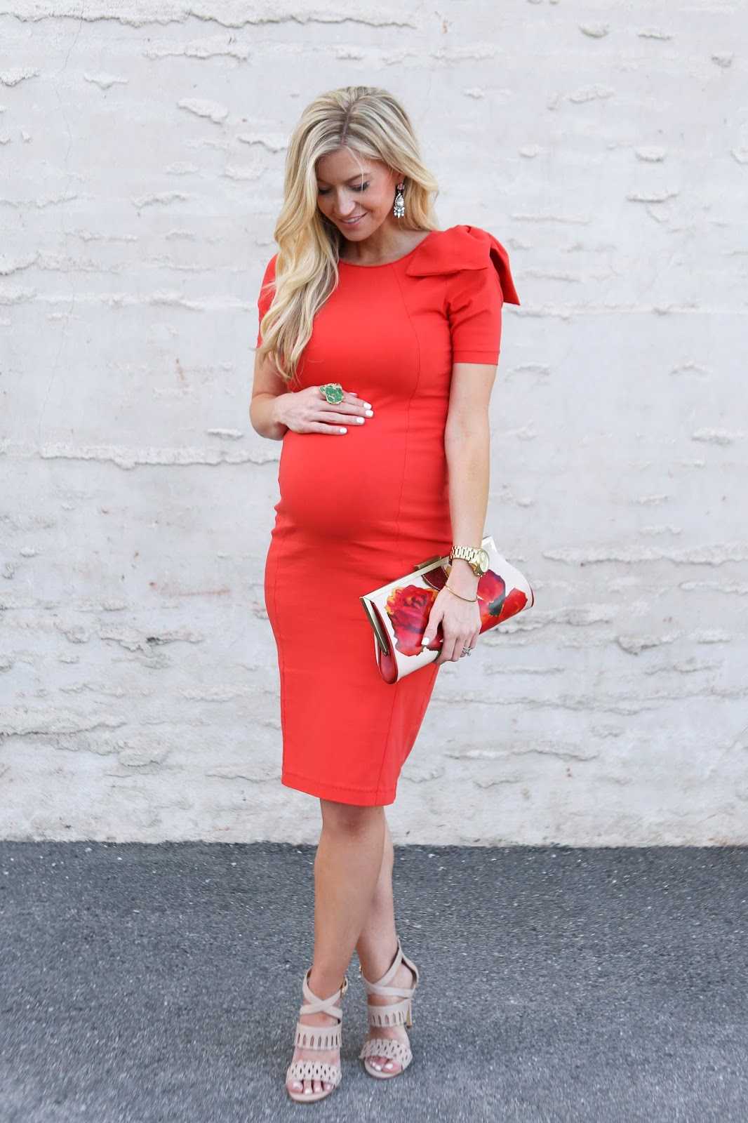 Коротенькие образцы выглядят очень мило. Но не в случаях, когда они всего на сантиметр ниже ваших ягодиц. Чтобы красное укороченное платьишко выглядело торжественно, под него нужны каблуки. Но будучи в положении можно смело заменить крутую шпильку удобными босоножками с невысокой танкеткой или ботиночками на устойчивом каблучке. Помпезность образа сохранится.