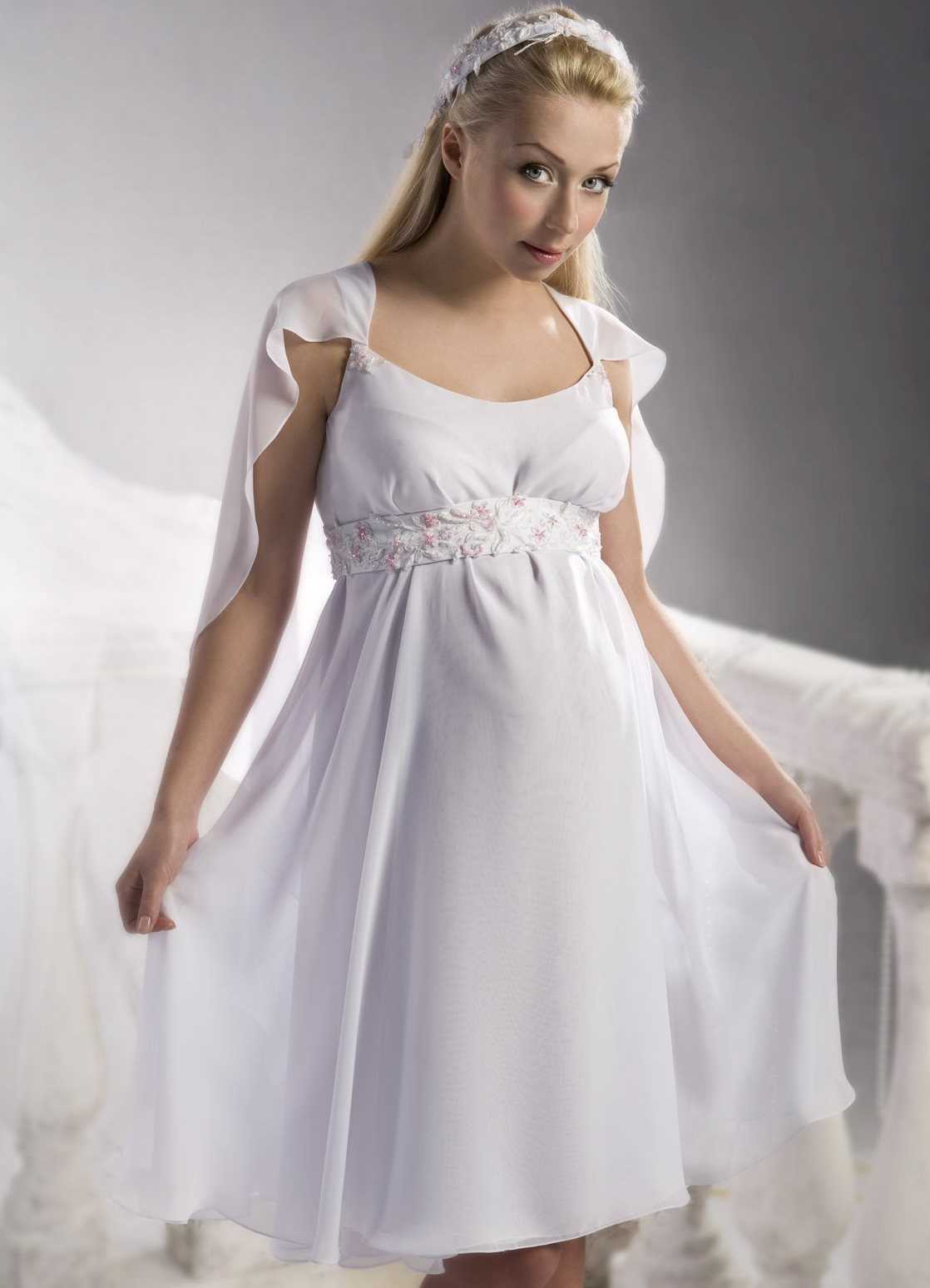 Отличным вариантом для летней свадьбы на позднем сроке беременности станет платье средней длины. Простой крой и отсутствие тяжелых декоративных элементов обеспечит будущей маме комфорт. Закрытый верх позволяет скрыть округлившуюся грудь и плечи, а завышенная талия, подчеркиваемая поясом с бантом, подчеркнет красоту вашего положения.